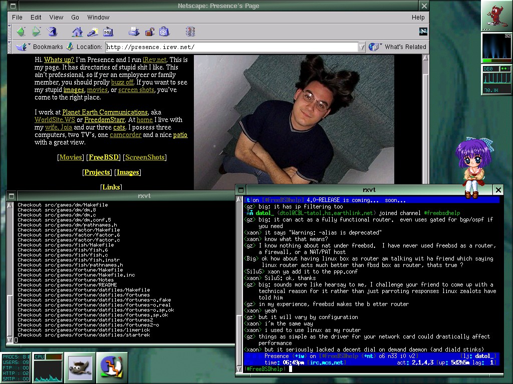 While the BBS computers ranged from 386 and 486 frankenboxes and 10-base2 coaxial networks, the iRev.net server was initially powered by dual Pentium 133mhz processors with 16 megabytes of RAM, running FreeBSD 3.3. Later, dual Pentium 500's, then dual 1.3ghz, and later dual 2ghz. Now, homed in a quiet 4-core Dell 9020 SFF with 8GB of RAM, the server continues to serve thousands of visitors a day. Always with FreeBSD, Apache, PHP, Perl, Bind, MySQL, and a number of mail handling packages from Sendmail, Qmail, Postfix, and Zimbra. Connectivity ranged from a fractional T1 line, a full T1 line, fiber OC3, Colocation, and even cable modems.
